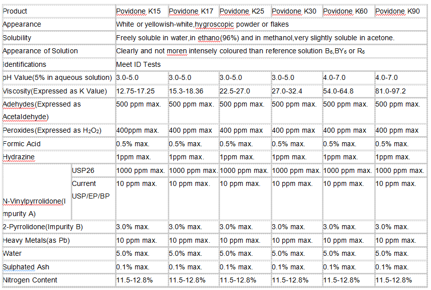 Product Properties: Povidone is a hygroscopic polymer ,supplied in white to creamy white powder or flakes,ranging from low to high viscosity & low to high molecular weight,which characterized by K Value.It’s easily soluble in water and many other organic solvents,with excellent hygroscopisty,film-forming,adhesive,chemical stability and toxicological safeness characters.